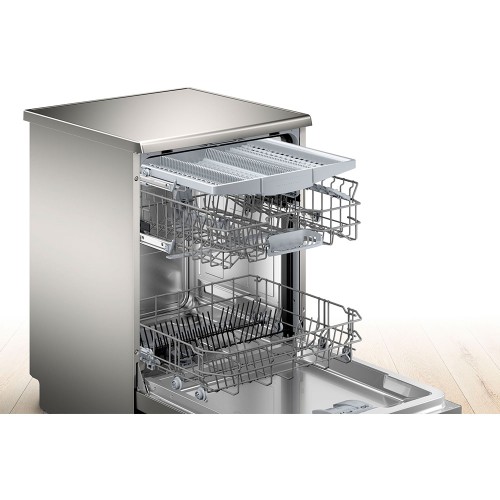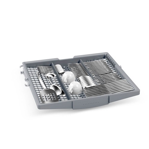 El lavavajillas Bosch SMS2HMI03E Serie 2 cuenta con las siguientes dimensiones: 84,5 cm alto, 60 cm ancho y 60 cm profundidad. Incluye una tercera bandeja VarioDrawer para cubiertos, liberando espacio para objetos más grandes en la cesta inferior. Además, la cesta superior se puede ajustar en altura.