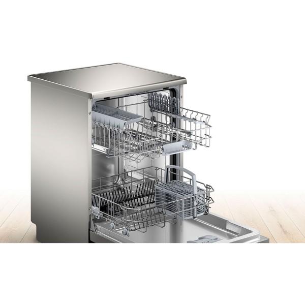 Sus dimensiones son: 84,5 cm de alto, 60 cm de ancho y 60 cm de profundidad. Cuenta con dos cestas para vajilla y un cesto para cubiertos. La cesta superior RackMatic permite ajustar la altura en 3 niveles diferentes, incluso con carga completa.