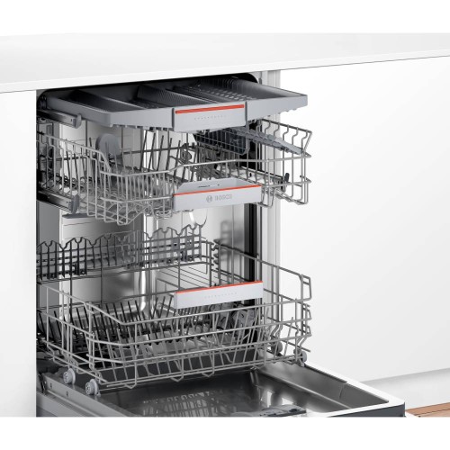 Cuenta con una innovadora tercera bandeja VarioDrawer Pro para cubiertos, equipada con zonas móviles y abatibles que se adaptan a diferentes tipos de carga, permitiendo así un mayor espacio y mejor organización interna. Además, la cesta superior RackMatic con 3 niveles de ajuste ofrece la flexibilidad de modificar la altura, facilitando la colocación de objetos grandes o de formas irregulares, incluso cuando la cesta está llena.