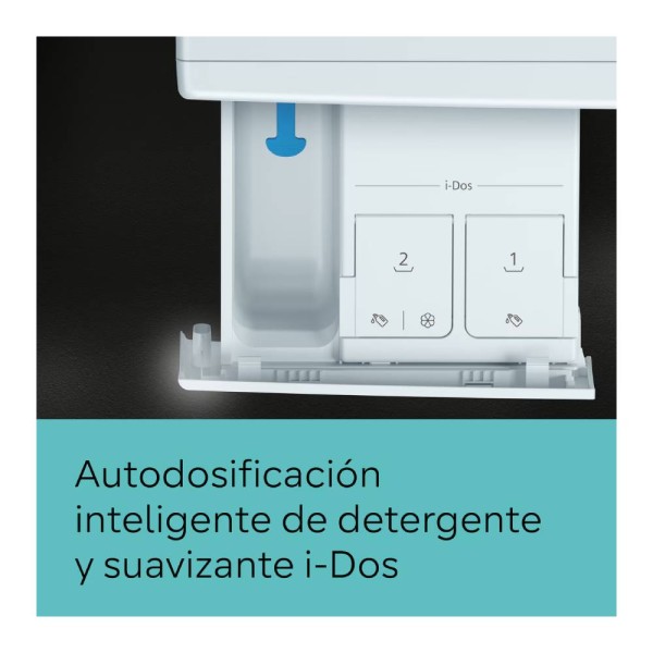 La dosificación inteligente i-Dos ahorra detergente y suavizante en cada lavado, evitando aclarados innecesarios. Solo tienes que llenar el recipiente del detergente y suavizante, y dejar que i-Dos añada la cantidad adecuada en función del tipo de tejido, la dureza del agua y el grado de suciedad. Así no tienes que perder tiempo calculando el detergente para cada colada.