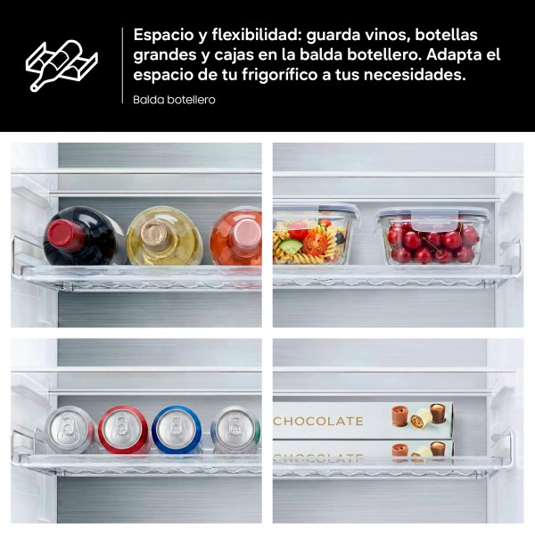 Guarda botellas más grandes en la puerta para no desperdiciar espacio en los estantes gracias a uno más grande que te ayuda a almacenar de forma segura botellas grandes, cartones voluminosos y otras bebidas. Es genial si quieres acceder fácilmente a tus bebidas favoritas en cualquier momento.