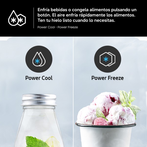 Con solo tocar un botón, la función Power Cool expulsa aire frío intensamente dentro del frigorífico para enfriar rápidamente tus alimentos o tus bebidas favoritas. Power Freeze envía una ráfaga de aire frío al congelador. Es ideal para congelar alimentos rápidamente o hacer hielo.