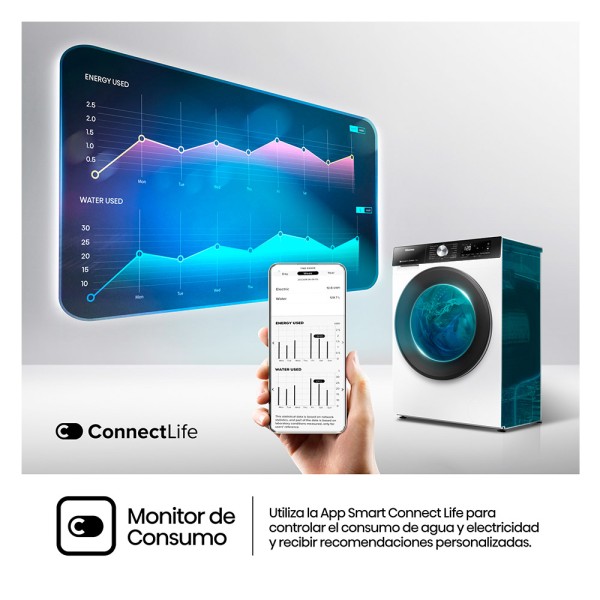 Utiliza la App Smart Connect Life para controlar el consumo de agua y electricidad y recibir recomendaciones personalizadas.