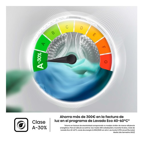 *Ahorro estimado en coste de energía (electricidad) consumida vs modelo Hisense de similares características clase E en 10 años con una media de uso de 284 coladas por año utilizando el ciclo de lavado ECO 40-60. Coste de energía tomado en consideración para el estudio 0,335€/kwh año 1, con aumento 5,99% anual.
